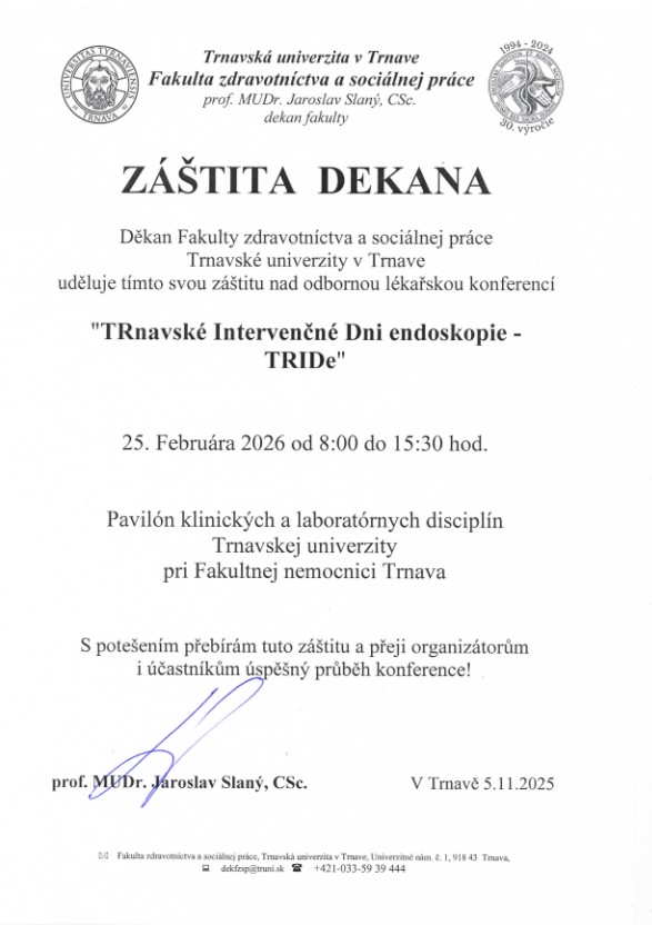 Záštitu nad konferenciou TRIDe prevzal dekan Trnavskej univerzity v Trnave prof. MUDr. Jaroslav Slaný, Csc.